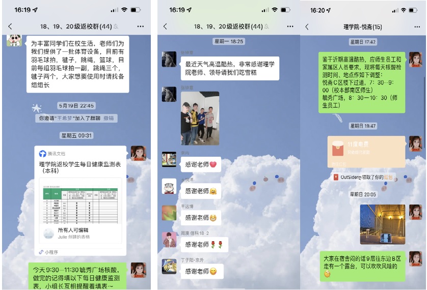 组织教职工和返校员工建立疫情防控党员先锋突击队和志愿者服务队、公寓构建楼长、层长、宿舍长管理服务体系,形成疫情防控的强大合力,凝聚合力织密防控网络,确保万无一失,使疫情传播“无处遁形”。