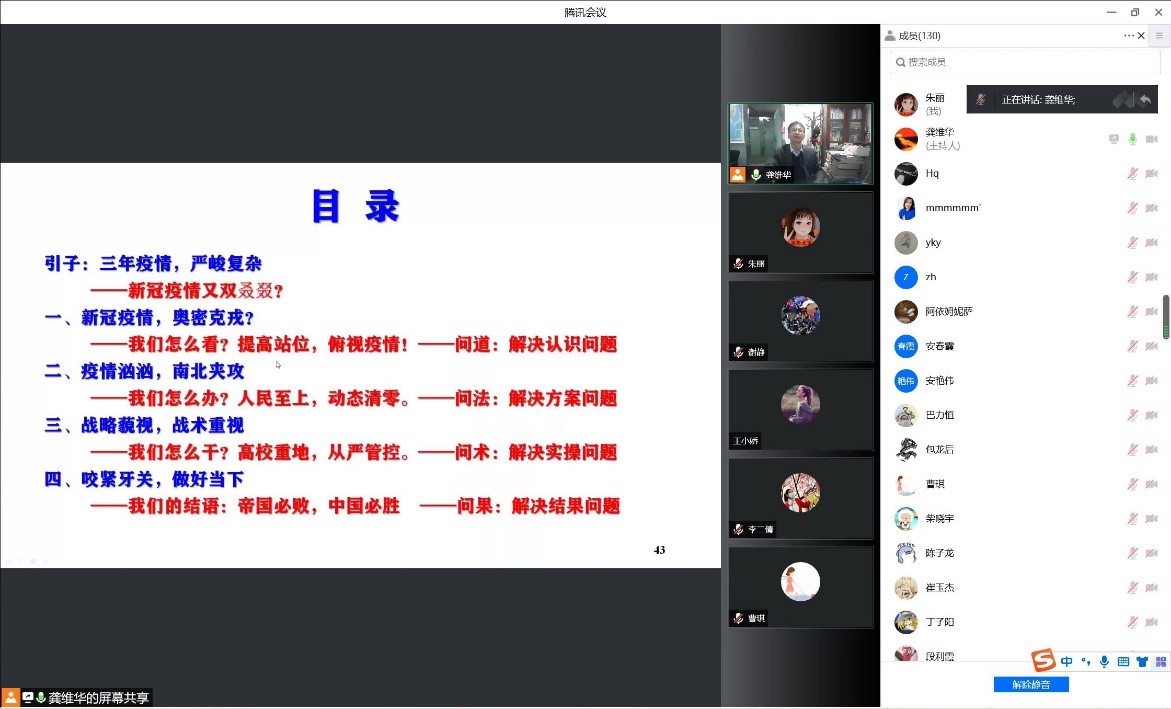 公司党委及时组织,召开全院师生疫情防控会议,传达上级和公司防疫情工作的安排部署。公司党委书记龚维华以线上网络课堂的方式,向全院师生讲授主题为“保持战略定力 打赢防控战役”的疫情防控“大思政课”,进一步提高认识、统一思想、要求师生坚定不移“听党话、跟党走”,坚持“动态清零”方针不动摇,坚决把疫情防控作为当前公司工作的重中之重,坚决筑牢校园疫情防控屏障。