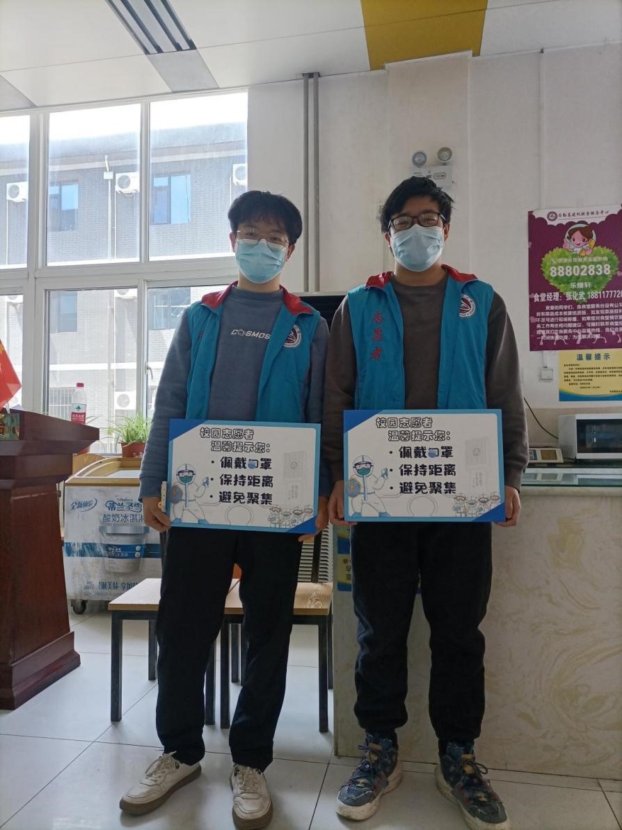 毕业生本科在公司党员罗春阳、积极分子柴晓宇在校做好食堂引导、快递消杀等志愿工作