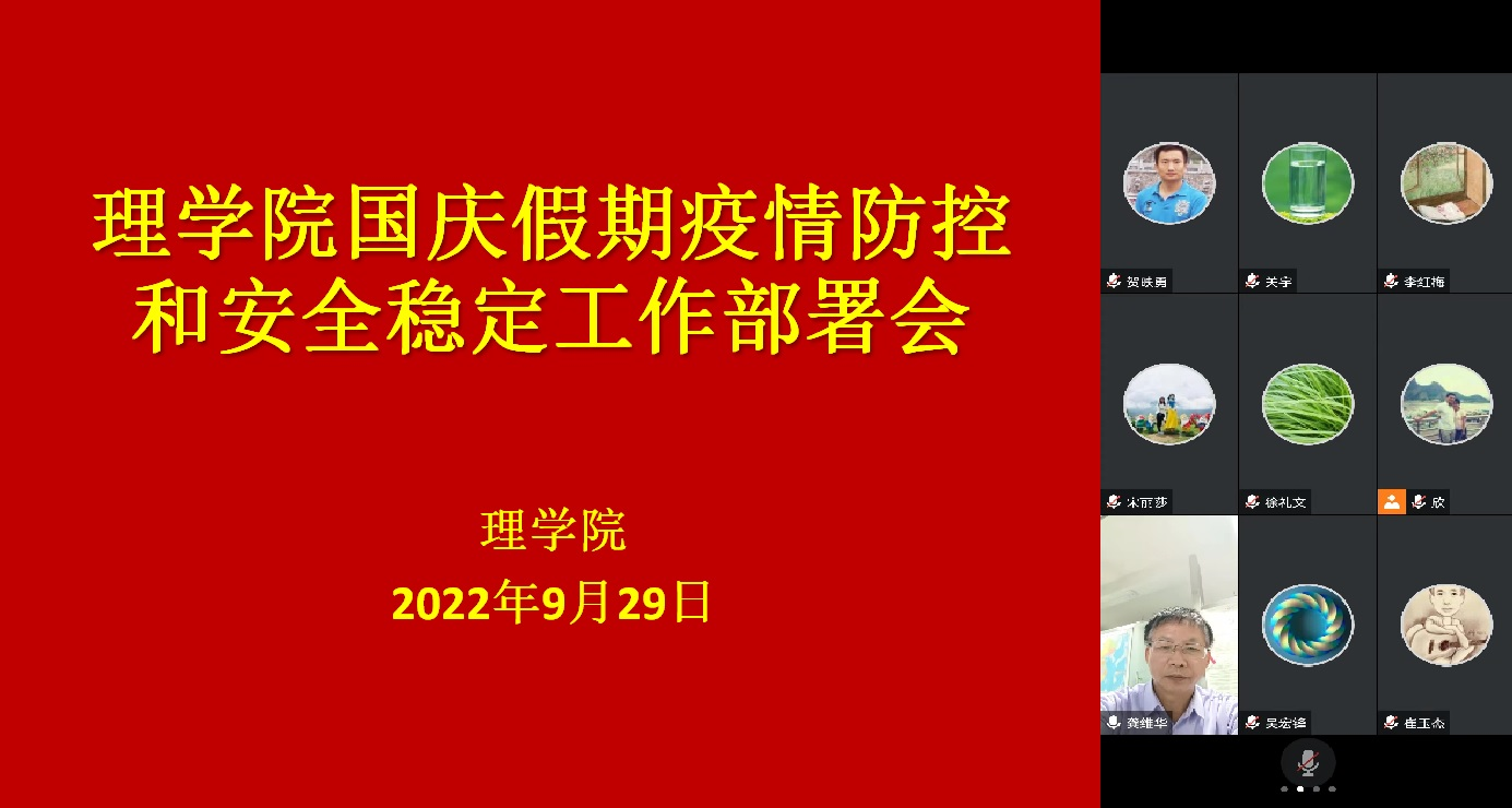 为落实公司关于国庆假期安全稳定工作的会议精神,9月29日晚,beat365线上召开国庆假期安全稳定和疫情防控工作部署会。公司党委委员、班子成员、系主任、责任教授、支部书记、班导师、辅导员、办公室全体老师参加会议。会议由公司党委书记龚维华主持。