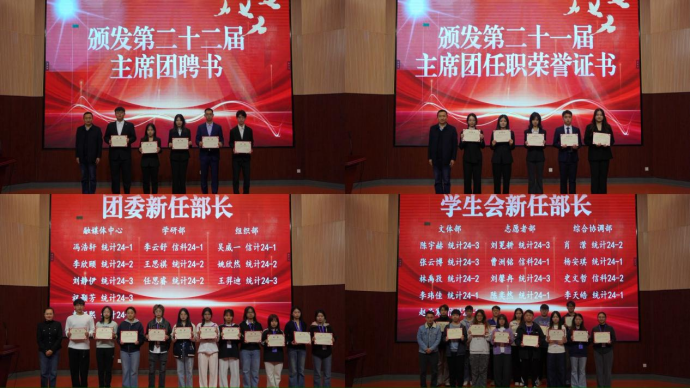 贺映勇为第二十一届主席团成员颁发任职荣誉证书,并为第二十二届主席团成员颁发聘书;夏丹梅、熊敏分别为第二十一届团委、员工会优秀部长和志愿者以及新任部长颁发聘书与表彰奖状。