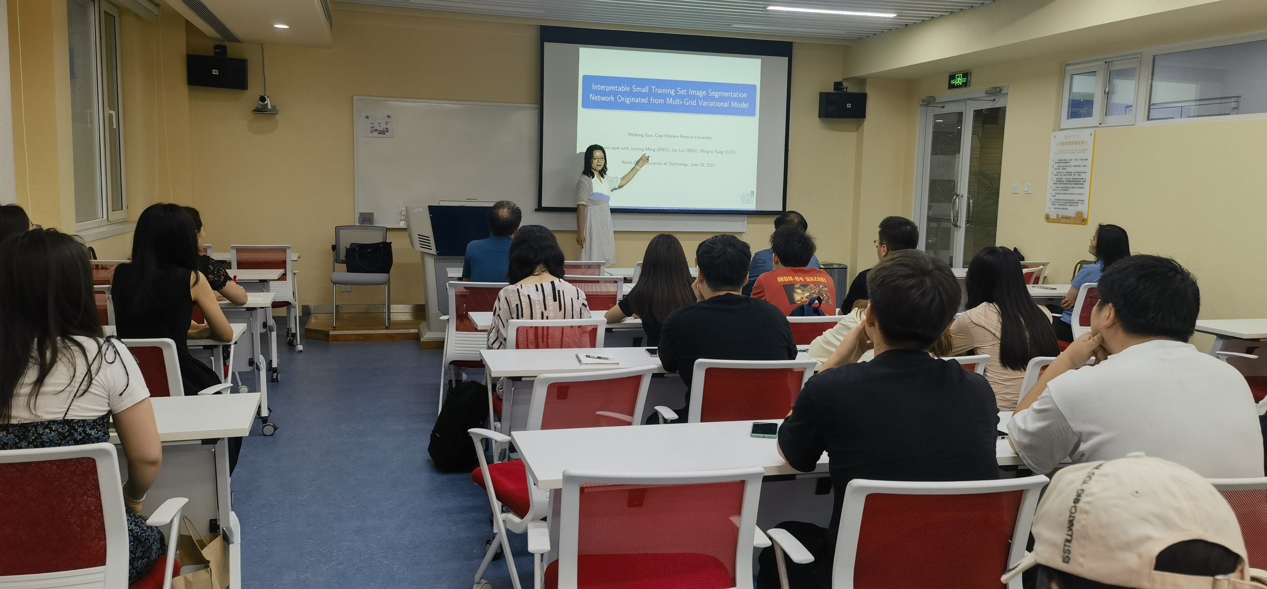 应beat365邀请,6月28日上午,美国凯斯西楚大学应用数学系系主任郭卫红教授来公司讲学,在广学楼406教室为公司师生做了题为“基于多网格变分模型的可判断小训练集图像分割网络”的学术报告。报告由beat365经理李冱岸主持。