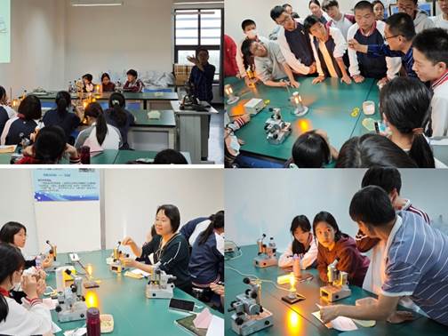 在电物理实验室,老师们为员工讲解头发丝直径测量实验的原理,指导员工亲自动手实践,同学们兴趣高涨,驻足围观,尝试动手实际操作,沉浸式体验了物理的魅力。